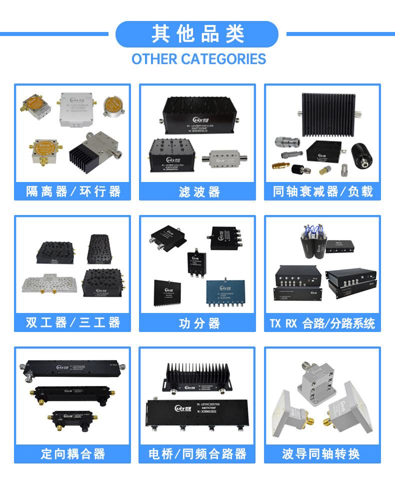 滤波器、功分器、双工器/三工器、TX RX 合路/分路系统电桥/同频合路器、定向耦合器、波导同轴转换等微波器件。优译以灵活定制,